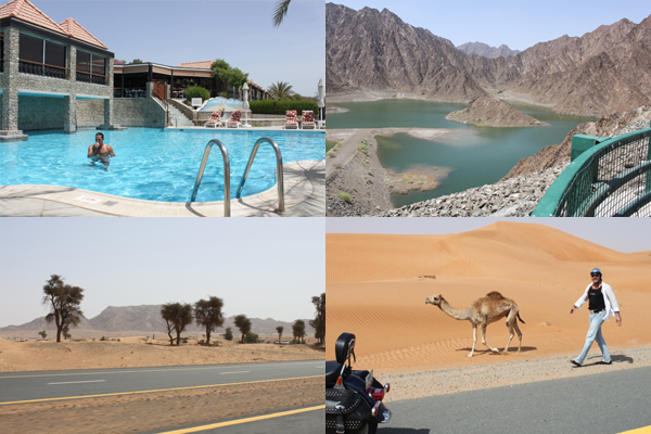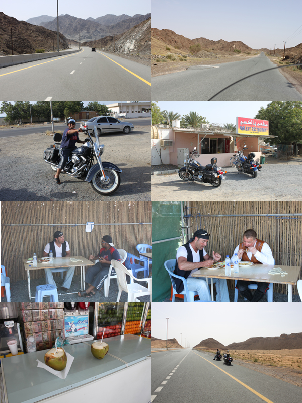 Unsere Familien verbrachten den Tag mit den Kindern im Wasserpark des Atlantis Hotels auf der Palme. Abends kamen wir dorthin und wir konnten gemeinsam einen herrlichen Abend bei dem gigantischen Abendbuffet genießen und alle hatten viel zu erzählen. Unsere weiteste Tour führte uns am fünften Tag nach Dibba, einer Stadt im Nordosten der Vereinigten Arabischen Emiraten. Wir starteten natürlich wieder früh morgens und fuhren zuerst Richtung Kalba, südlich von Fujairah entlang am Golf von Oman. Unterwegs kamen wir durch das Al Hajar Gebirge – also auch wieder eine sehr abwechslungsreiche Tour mit vielen verschiedenen Stationen und Eindrücken. Besonders wichtig auf diesen Touren sind natürlich häufige Pausen um genügend zu Trinken; dabei ergibt sich immer wieder auch die ein oder andere nette Begegnung mit Einheimischen, die gerne und ausgiebig plaudern und die Motorräder bewundern. Gegessen wird unterwegs immer sehr traditionell in den einheimischen Lokalen und es schmeckt besonders lecker.